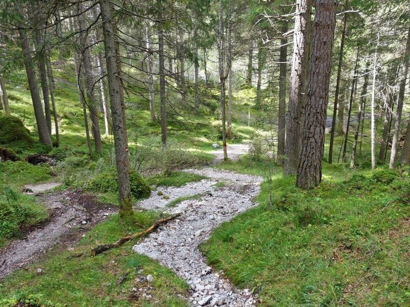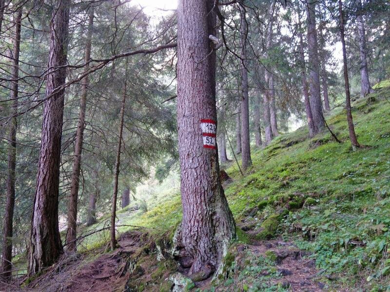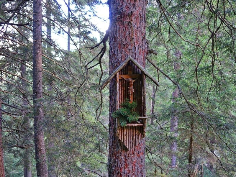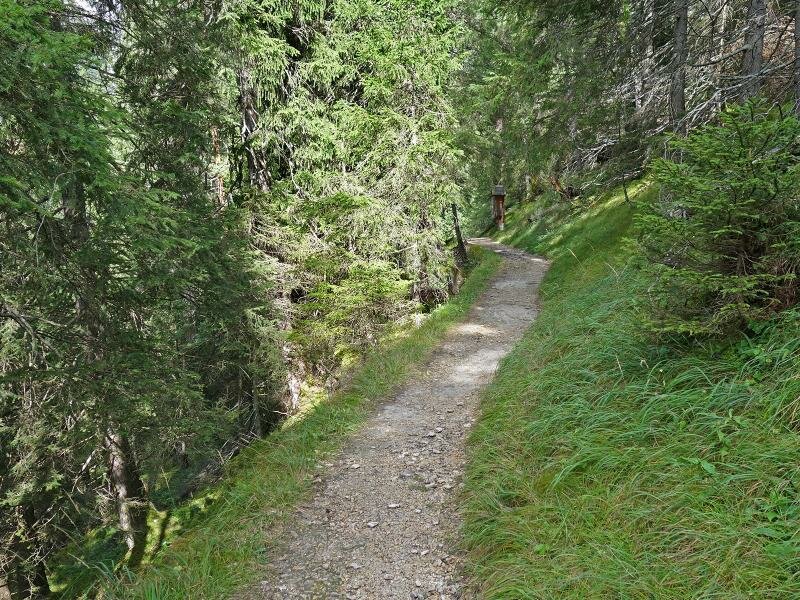Sotto la chiesa nel centro di Gschnitz attraversiamo il ponte sul Rio Gschnitzbach che conduce all’inizio del sentiero n. 52. Si tratta di uno stretto sentiero attraverso il bosco Geigerwald. Dopo la salita alla valle Martairtal attraversiamo un altro ponte e proseguiamo sul Sentiero dei Pellegrini (Wallfahrtsweg, o Trinser Stationenweg). Questo percorso prende inizio da Trins e rappresenta l’ultimo tratto della nostra salita al santuario.