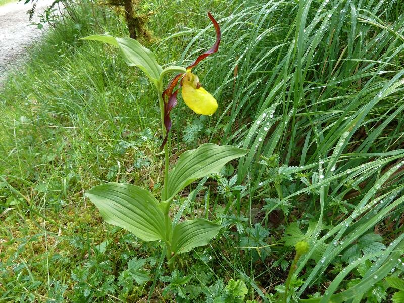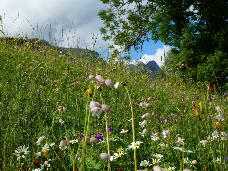 Dalla sponda a sud camminiamo verso il fondovalle. Il primo tratto è asfaltato. Adesso, all’inizio di giugno, tanti prati sono un mare di fiori. Passiamo dal ristorante Pumafalle e proseguiamo prima su una strada forestale e poi su un sentiero nel bosco, alla riva del torrente, oltre il paesino.