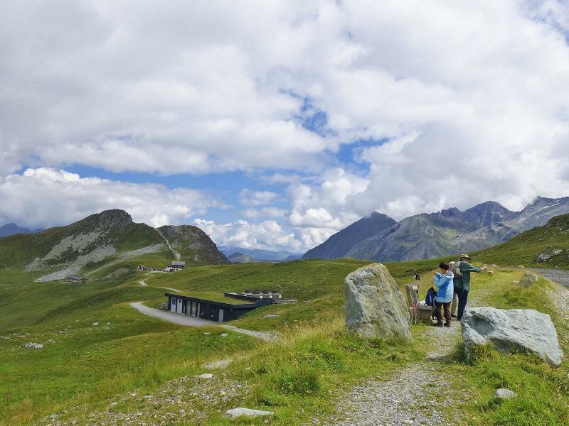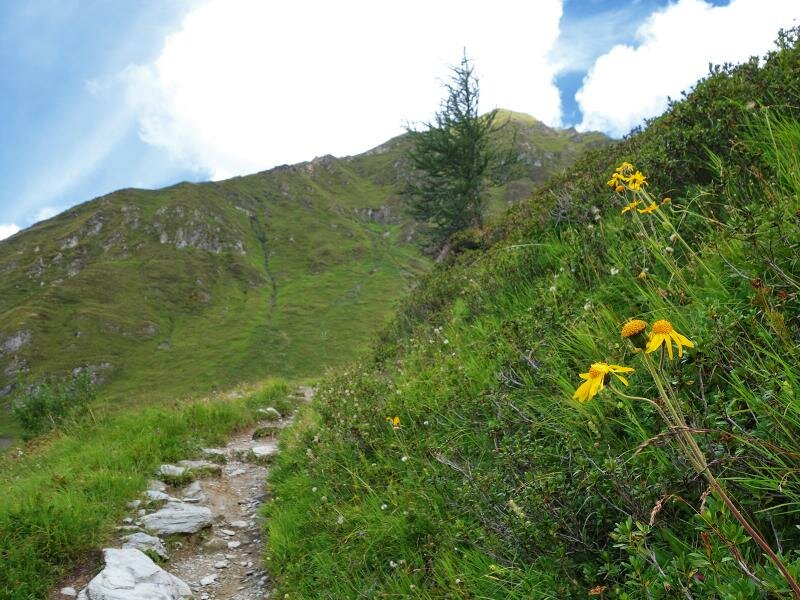 Dopo ca. 2 km, a 1.750 m s.l.m., arriviamo al segnavia che propone due percorsi diversi per raggiungere il Tuxer Joch: una salita diretta e un’alternativa che passa dalla parete Frauenwand a 2.541 m s.l.m. Scegliamo la prima opzione (sentiero n. 324) e saliamo lungo un sentiero ripido, parzialmente fatto di scalini, attraverso il bosco. Arrivati al limite degli alberi si apre una vista impressionante sulle montagne circostanti. L’ultimo tratto in salita attraversa un paesaggio di prati e landa, dove fioriscono erbe e fiori alpini.