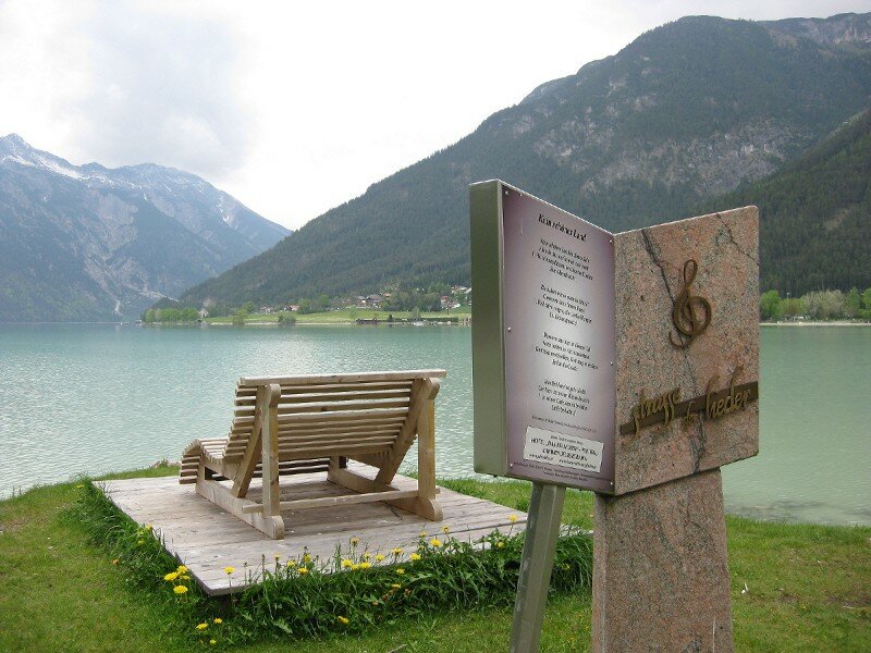 Qui inizia anche il percorso tematico “Strada delle Canzoni” (Strasse der Lieder) che ci porta direttamente lungo la riva del Lago Achensee ed è percorribile anche per sedie a rotelle e passeggini. Abbiamo appena lasciato dietro di noi la prima stazione di in tutto 12 stazioni che si trovano sparse sul percorso di 2 km, quando sentiamo rumori e fischi. Il Trenino Achenseebahn si avvicina e siamo stupiti della sua grandezza, ovvero, da quanto è piccolo! Il bigliettaio sorride e ci saluta cortesemente. Proseguiamo il nostro cammino lungo la “Strada delle Canzoni” fino a giungere all’approdo navale a Buchau. E proprio qui termina il percorso tematico ed abbiamo quindi superato la prima parte della nostra escursione.