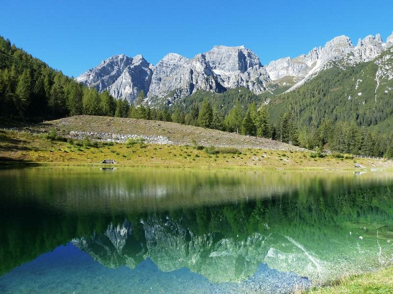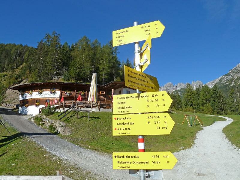 Presso Fulpmes nella valle Stubaital saliamo con la Cabinovia Kreuzjoch (Schlick 2000) alla stazione intermedia (1.370 m s.l.m.), dove si trova la Malga Bruggeralm. Da qui intraprendiamo il sentiero n. 114 (strada forestale Panoramasee). Dopo 30 minuti raggiungiamo un piccolo lago, sul quale si specchiano le vette delle montagne Kalkkögel. Continua per altri 15 minuti la salita sul sentiero “Erlebnisweg Schlickeralm” fino alla Malga Schlickeralm (1.660 m s.l.m.).