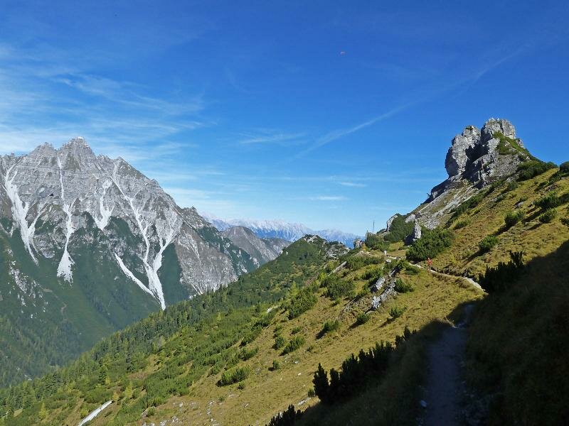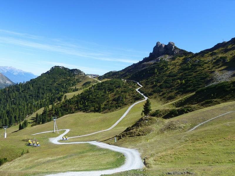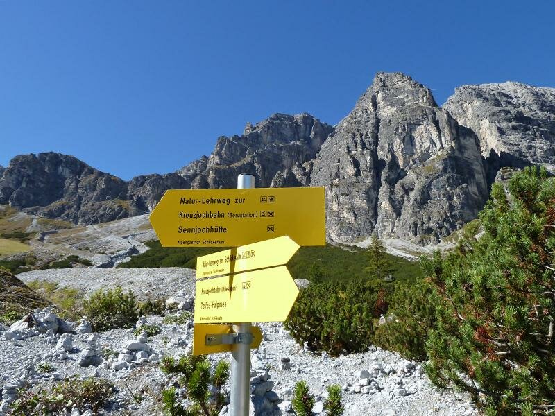 Proseguiamo sul sentiero n. 116, che sale lungo la valle in direzione Malga Zirmachalm. A 1.900 m di altitudine svolta a sinistra e sale lungo il pendio fino alla malga e al Rifugio Sennjochhütte (2.230 m s.l.m.). Da lì si gode di una bella vista sulla Serles fino al Ghiacciaio Stubai. Un piccolo sentiero ci porta alla stazione a monte della cabinovia passando sotto il Passo Kreuzjoch.