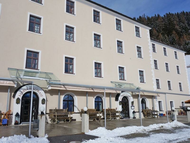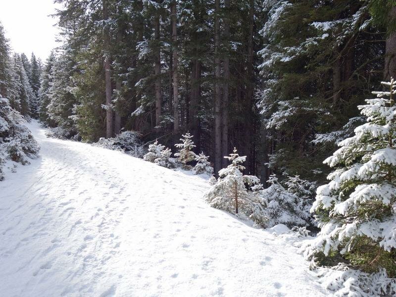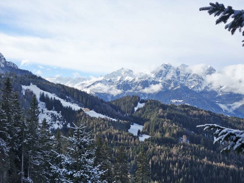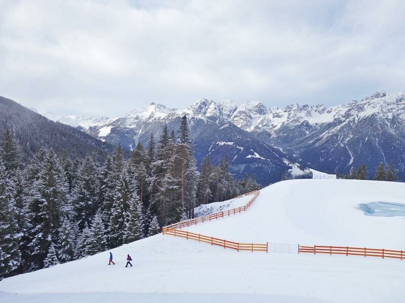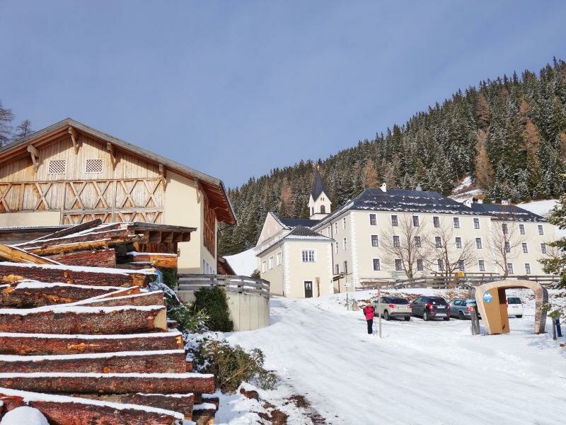 La cabinovia Serles (da Mieders) ci porta al nostro punto di partenza: il ristorante Koppeneck alla stazione a monte dell’area sciistica. Seguiamo il segnavia “Maria Waldrast” e in meno di un’ora di tranquilla passeggiata sulla neve arriviamo al santuario.