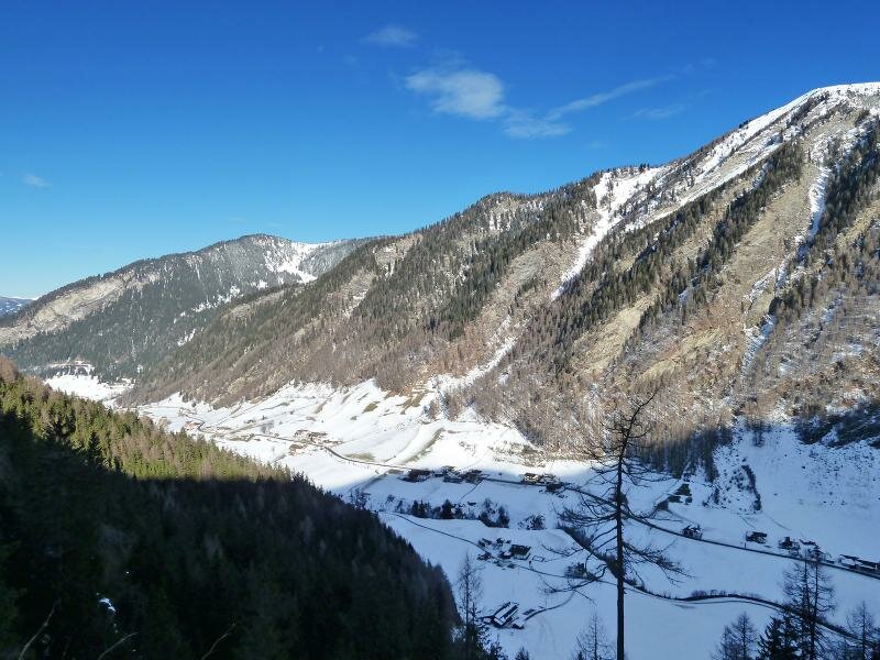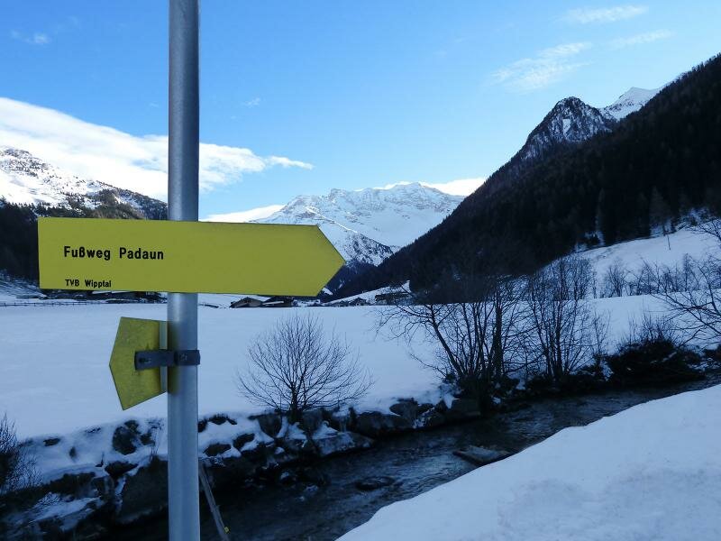 Padaun è la soleggiata frazione del comune Vals nell’Alta Valle Isarco (Wipptal) che andremo a visitare. La nostra escursione parte all’inizio della valle Valsertal, nella frazione Kolb a Ausservals. Le montagne proiettano lunghe ombre e non un solo raggio di sole riesce ad illuminare la valle. Camminando nella neve seguiamo la segnaletica “Fussweg Padaun”.