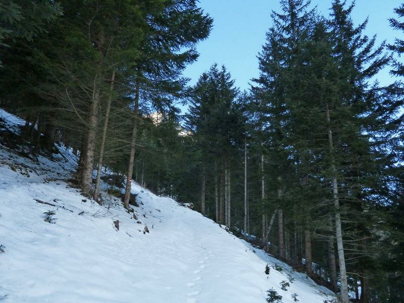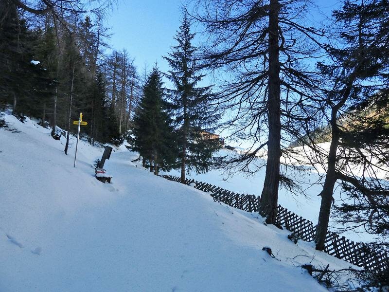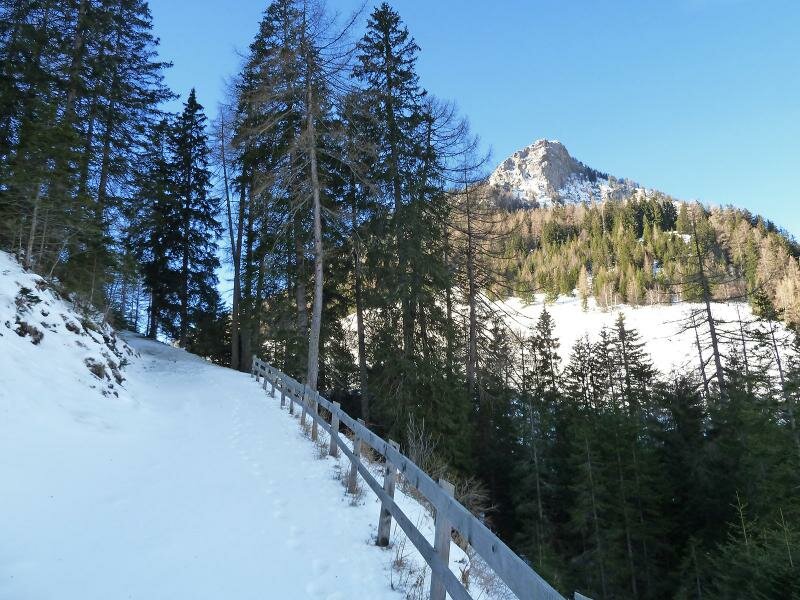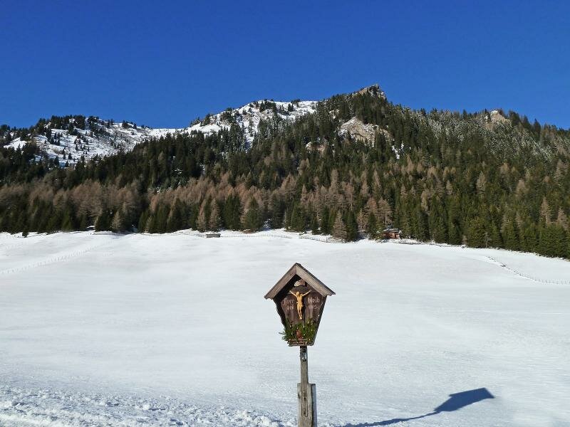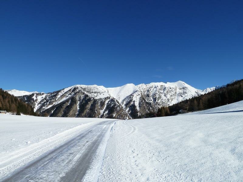 Questo percorso è molto ripido, ma visto che non c’è molta neve, si può tranquillamente farlo con scarponi invernali. Dobbiamo fare ca. 280 m di dislivello per arrivare in cima, dove il percorso imbocca una strada asfaltata, che è più lunga e meno ripida. Nelle vicinanze del ristorante Steckholzer raggiungiamo l’altopiano soleggiato, i prati innevati di Padaun.