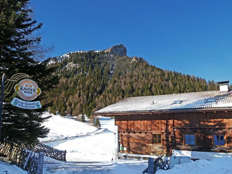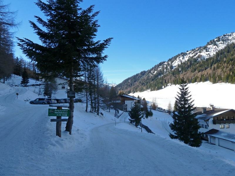 Seguiamo la strada per 1 km, fino alla fine della strada asfaltata. Sulla via del ritorno ci fermiamo al ristorante Steckholzer. Per la discesa consigliamo la strada asfaltata (e poco trafficata), che è più lunga ma meno ripida. La vista si apre verso il monte Serles (2.717 m s.l.m.) nelle Alpi dello Stubai a sinistra e verso il monte Olperer (3.476 m s.l.m.) nelle Alpi di Tux sulla destra.