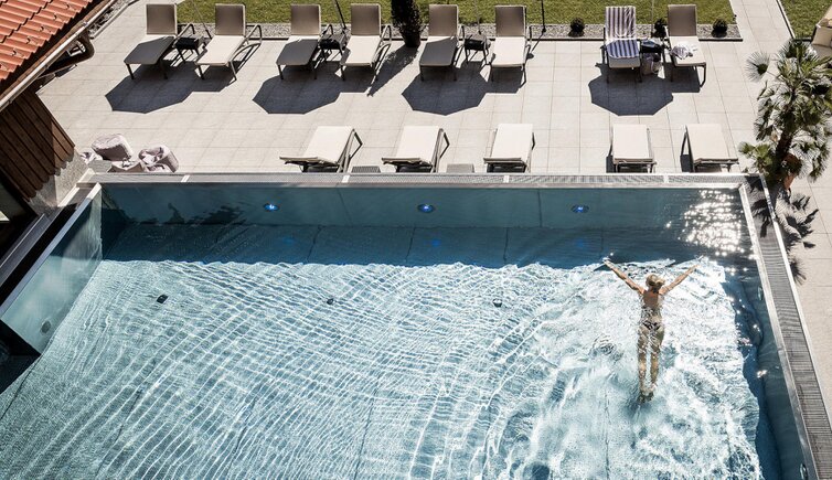 Nell’area benessere di 1.000 m² troverete, tra l’altro, una piscina coperta, una sauna alle erbe, un bagno turco, una cabina a infrarossi, una vasca Kneipp, una vasca idromassaggio, una sala fitness e massaggi. Le spaziose sale relax offrono una magnifica vista sulle montagne e hanno accesso diretto a diverse terrazze solarium e al prato per prendere il sole in giardino.