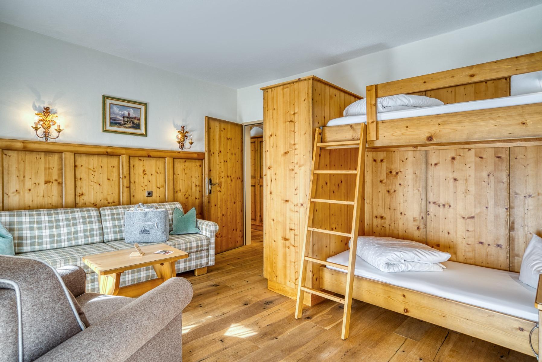 Negli appartamenti dell’hotel, le camere familiari e le suite di pino con una occupazione di 4 persone, la 3a e la 4a persona sono ridotte del 50%.