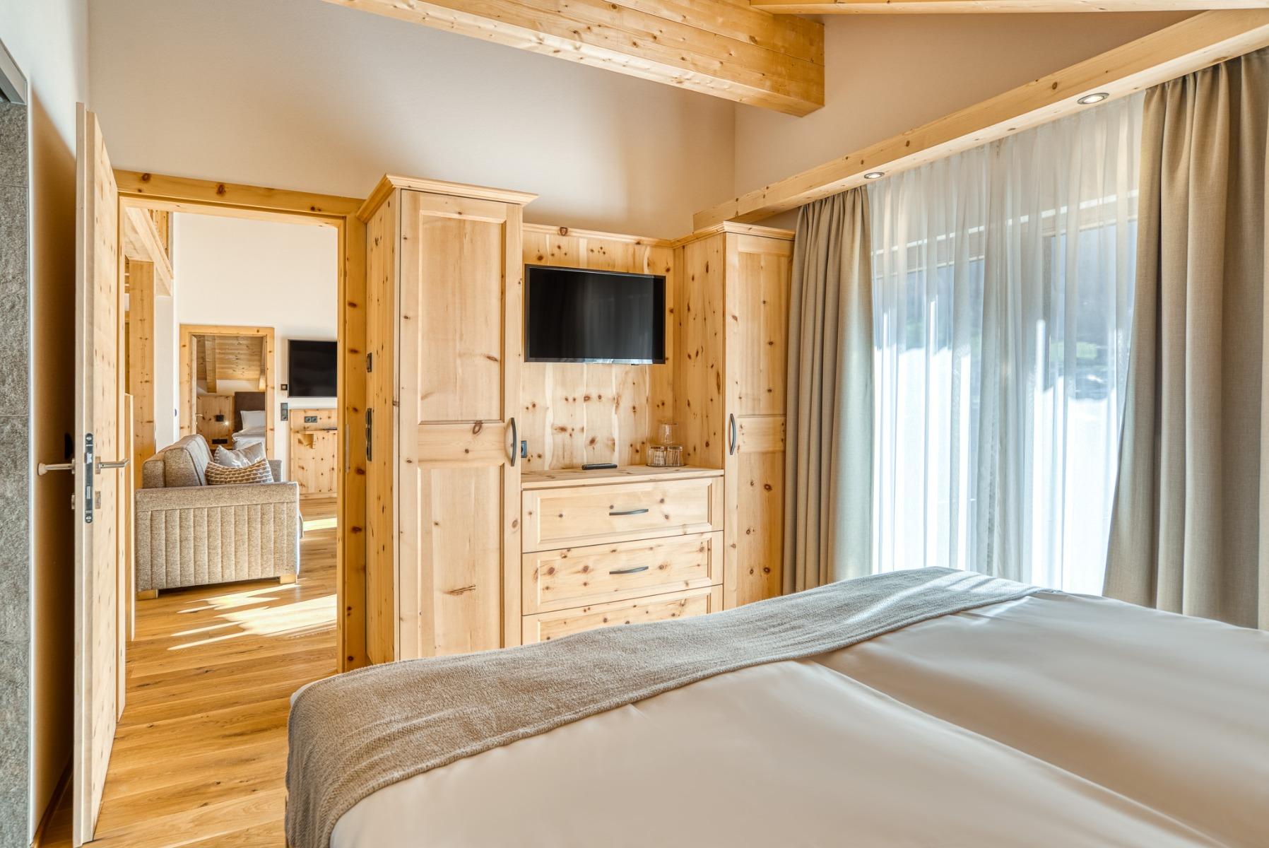 Tutte le camere e le suite sono arredate con legno di pino cembro o di larice non trattato e promettono ore rilassanti e riposanti.